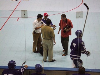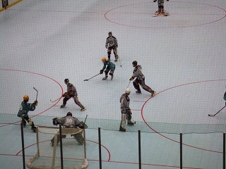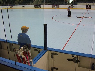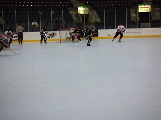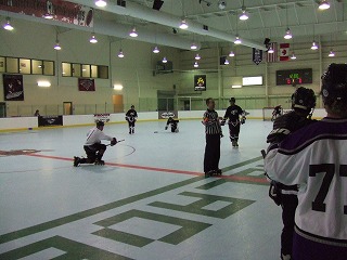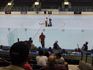 FloridaのGuys達の姿が見えないというラッキーぶりであった。試合開始時にやっと1セット分の人数揃い,ゴーリーもまだ準備中のチャンスタイムである。しかし,Guys達はプレイヤー5人でパックを回し,なかなかこちらの自由にはならない。そうこうするうちにGuysの人数も揃い,しかもどうも相手は昨日から助っ人を雇ったらしく,人数&若さともにパワーアップしていた。というわけで,その後は先制するも追いつかれという激しい点の取り合いとなり,おいそれと筆者が登板する雰囲気ではなかったのである。そんな中,昨日のビデオ判定で筆者とともにやり玉に挙がったK王が大活躍で筆者よりも先にゴールをゲット(したと記憶してるが合ってますか?)!その後も活躍し,アシストとかもしてた(と記憶してますが合ってますか?)もはや筆者のライバルではなくなったのであった。最終的には7−7という引き分けになり試合終了。NARChファイナル初勝利はお預けとなった。