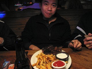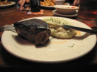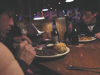 各々好みのステーキを注文。みなさんリブを頼む中、筆者はフィレステーキ少なめで。団長とマサさん達は前日入りして昼はゴルフでもと思っていたが、人数が足りないこともあり結局乗馬をしたそうだ。夜はNHLの試合を観に行ったとのこと。