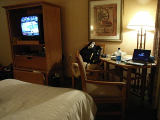 ホテル着,ロビーでチェックインするが本隊はいない模様。カードを渡され部屋に行く途中、ホテルの中庭がすごい色遣いしかもプール付き。やっぱアメリカは違うぜ!
