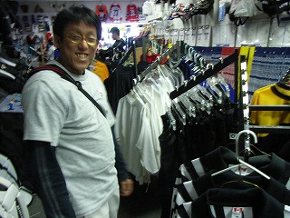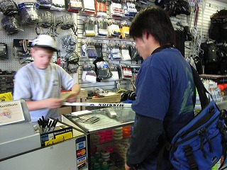 そういわれたら行かずにはいられない一行は2軒目へ。店頭の雰囲気は1店目とほぼ同じであるが、店内はレイアウトが少し違う。団長がバッグを修理してもらっている間にオジサンたちは再び物欲モードに。まずは浪ちゃんがレガーズとZ-BUBBLEシャフトを購入。Mission?くんは頼まれものと弁解しながらHEX-1を購入(ほんとはピンクを頼まれていたらしい)。そして大外から一気にまくってきたのは店長!ワンピーススチックを一気に2本(StarskieとHEX-1)お買い上げ!!しかもスチックはそのままでは短いので、長いエンドを追加工してもらっていた!