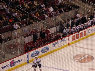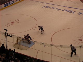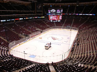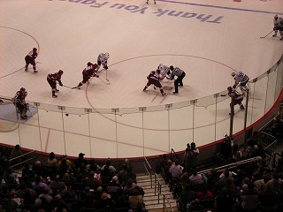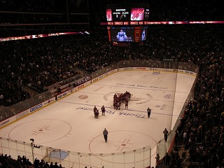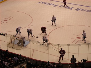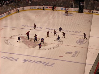 練習が開始され、みんな生で見るNHL選手に感動。団長とマサさんは一昨日も観に来たらしい。そして選手紹介と国歌斉唱が行われ、フェイスオフ!試合はシーソーゲームとなり延長でも3−3のまま決着が付かず、最後はPSに。コヨーテスが2人決めてPSを制したので、会場はすごい盛り上がりであった。