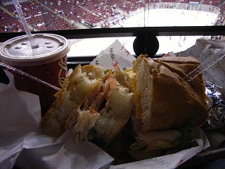 席を確認し、各自夕食を。ナーチ優待券でホットドッグとソフトドリンクがサービス。ホットドッグ1個では足りずにターキーサンドを追加した。