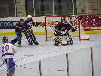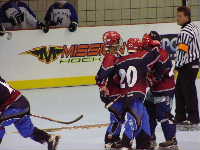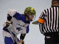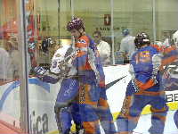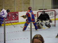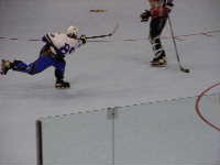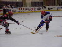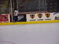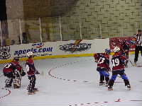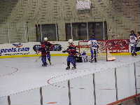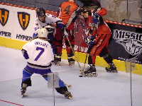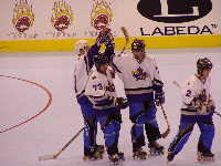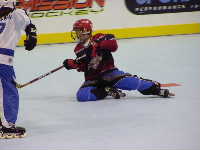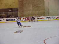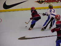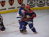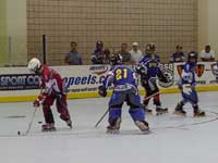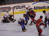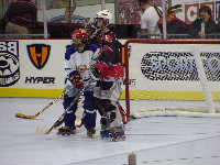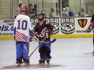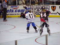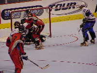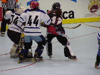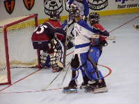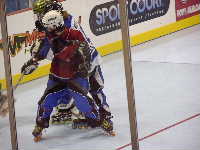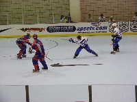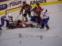 Hockeyという長ったらしい名前のミシガンのチームとの対戦である。なんか変わった色のジャージだなと思っていたら,新興メーカーNEXEDのスポンサードを受けている模様(←だからさ,そんなことはどうでもいいから)。ブルーとオレンジがベースで,なんとなく全身地球防衛軍的な雰囲気を漂わせている。もしかしたら弱いんじゃない?という期待を裏切り,ヤツらは思いの外強いことがすぐに判明した。試合の詳細については高田夫妻によるMHL公式レポート( http://www.inline-hockey.org/narchfin/2002/index.html )を読めばわかるのであるが,メイプル奮闘むなしく今大会初の0−8コールド負けとなってしまった・・・ゴールドでもこんな強いチームがいるとは恐るべし北米である。