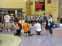 少し早めであるが歩いて会場へ。行く途中でポツポツと雨が。会場に入りまずはNARChショップに挨拶。小手調べでNARChT−シャツをおみやげ用に10数枚購入。「やあ!元気?」と挨拶すると今年もウィンクして1枚$10のところ3枚$20にまけてくれた。そのあとはサブリンクのほうでメーカーのブースを見る。HYPERのブースで編集長から頼まれていたT−シャツを購入。メインアリーナに戻り会場内を撮影する。その間に外は大嵐となっていた。しばらくジュニア系の試合を観ていたが,そろそろ試合の時間,選手の移動は大丈夫であろうか?