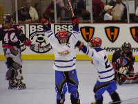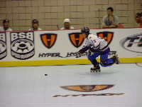 Vixensというチーム。さすがカリフォルニア,背中にはPROJOY,MISSION,肩にはLABEDAのマークが入りマルチ・スポンサードなジャージである(←だからそんなとこ見てないで,ちゃんと試合見とけって!)。そしてFaceOff!ここから試合の模様については高田夫妻によるMHL公式レポート( http://www.inline-hockey.org/narchfin/2002/index.html )を参照していただきたい。とにかくまたもや惜敗という感じでなんとも悔しい限りではあったのだ。
